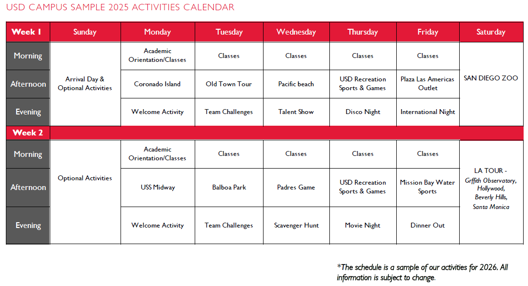スペインルネサンス調の白い建物が青空に映える美しいキャンパスは、「Princeton Review誌」において全米で最も美しいキャンパスの一つに選ばれています。暖かい日差しと涼しい風が吹く典型的なビーチの気候の中、サンディエゴの美しいビーチにも簡単にアクセスできます。寮滞在のため、夜まで充実したアクティビティが用意されており、学びと遊びを両立して楽しむことができます!