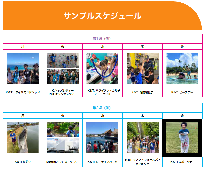 ハワイの人気観光名所以外にアメリカのお仕事体験や農場体験などの体験型、アート&サイエンス系など種類豊富なアクティビティが用意されています。また、プログラム終了後はプログラム参加中の写真を集めたウェブアルバムが頂けるのでプログラム参加中の様子を見ることができます。