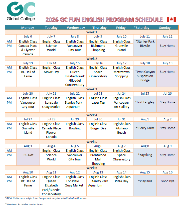 バンクーバーのダウンタウン中心に位置し、バラード駅から歩いて5分。学校が入っている建物の1階にはセブンイレブンがあり、周辺にはおしゃれなカフェが立ち並びます。少し歩くとコールハーバーの海沿いの公園や散歩道もあります。午前中に15時間の英語レッスンを受け、午後からはバンクーバーの観光名所を巡るアクティビティを楽しめます。