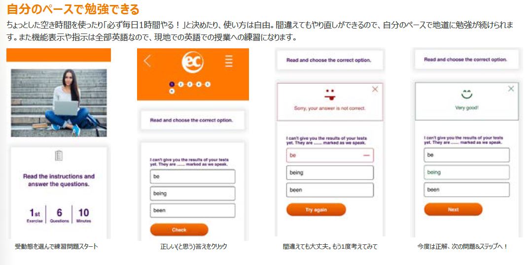 申し込みと同時に利用が開始できるECオンライン。渡航前に少しでも英語を英語で学ぶことに慣れておきましょう。ECオンラインは、留学中も自己学習管理ツールとして活用します。 |